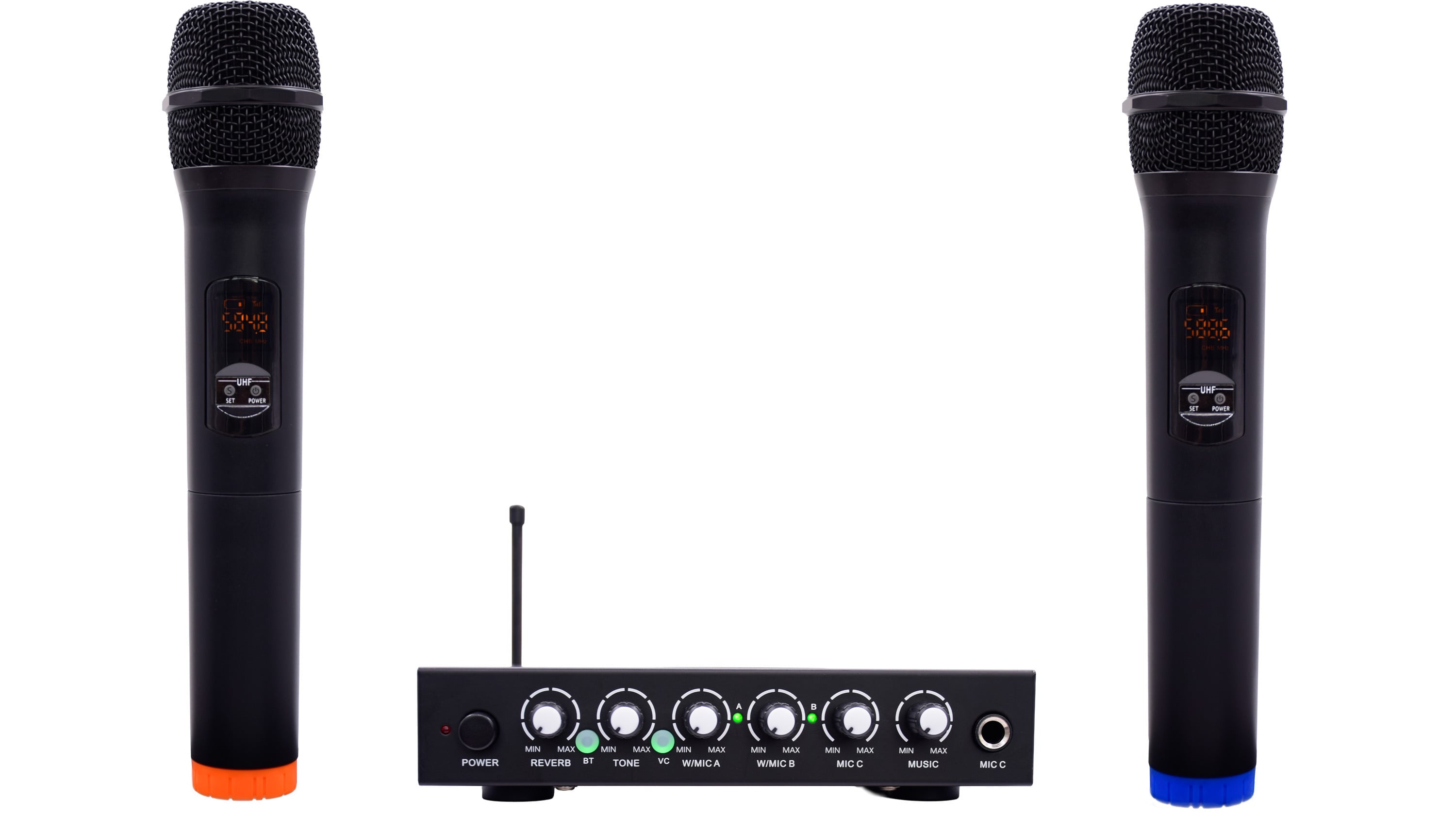 Bluetooth 5.3 • HDMI, optinen ja AUX (sisään ja ulos) • Kaksi langatonta mikrofonia 863–865 MHz (UHF) • Säädettävä kaiku, sävy ja äänenvoimakkuus • Yli 10 metrin langaton kantama